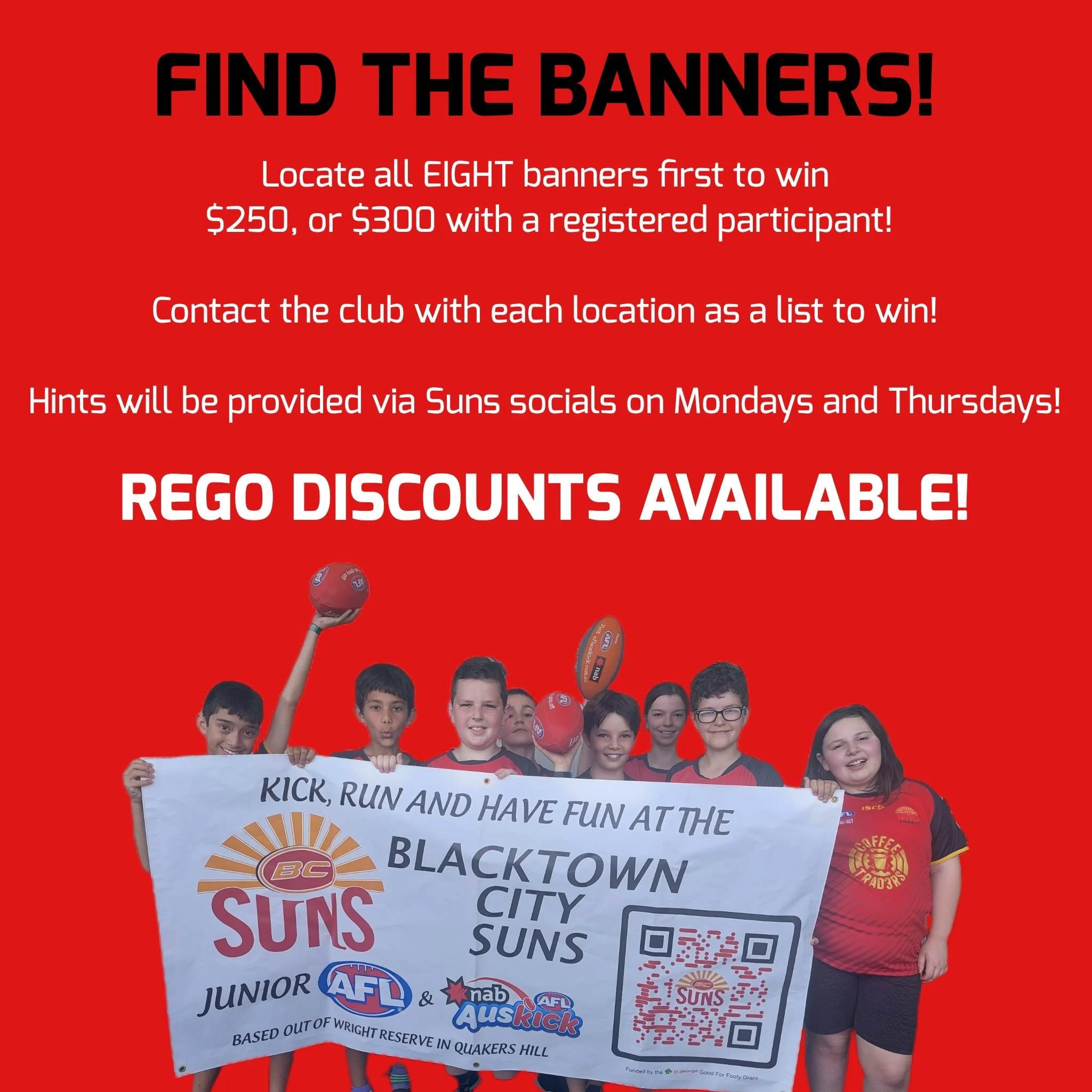 There is a $250 cash prize available to the winner, however that will be increased to $300 if you register a participant to the Suns in 2023! There are also discounted junior footy registrations up for grabs to anyone who contacts us via socials or email with a banner location, so everyone can be a winner!